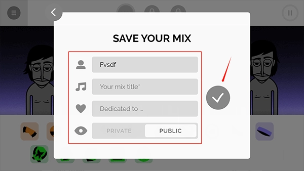 5、以录制为例,完成节奏混音的录制后,设置好混音的名字、标题和权限,再点击右侧的√即可。