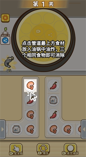 1、点击管道最顶端的食材,将其放入油锅中进行油炸,当出现三个相同的食物时就能消除。