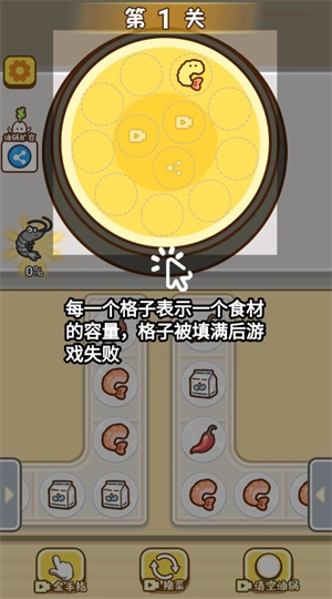 3、每个格子代表一种食材的容量,当格子被填满时游戏即宣告失败