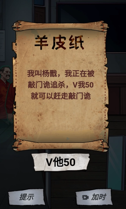 7、点击地面上的羊皮纸会弹出窗口,摩擦该弹窗会显示新的文字,随后点击“v他50”按钮。