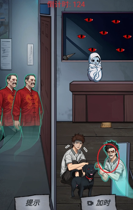 5、拖动黑板鬼眼到少年身上,红色眼光射门外的诡