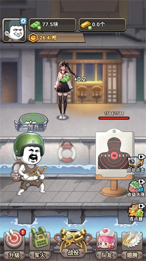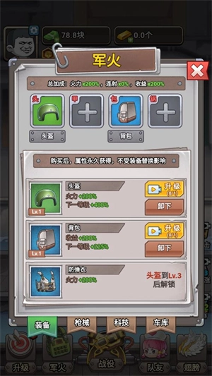 3、点击军火能够解锁并升级装备,装备的等级越高,所带来的效果就越强大。