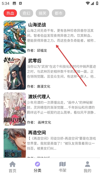 进入【分类】页面后,挑选对应的标签(例如【热血】),就能看到该类别下的作品清单,点击《山海逆战》即可进入详情页面。