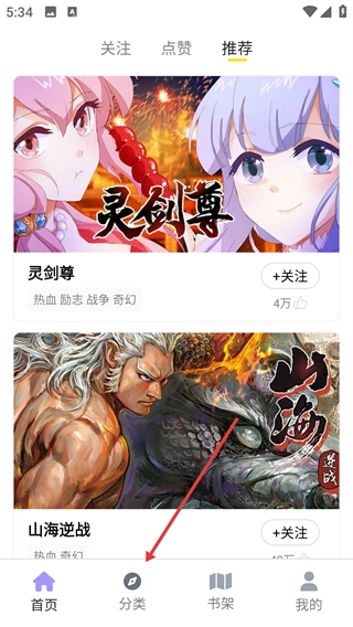 在首页的推荐列表里,你可以挑选感兴趣的作品,点击底部的【分类】按钮就能按照类型来筛选内容。