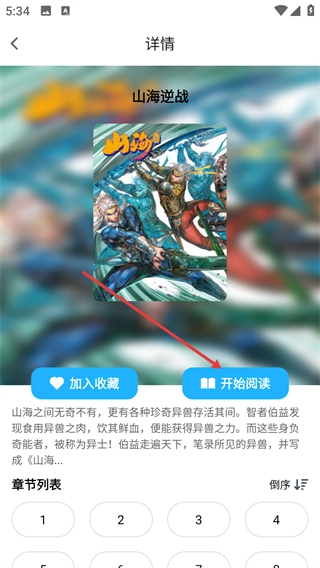 在《山海逆战》的详情页面,你可以点击【加入收藏】按钮来保存这部作品,也能直接点击【开始阅读】按钮进入阅读界面。