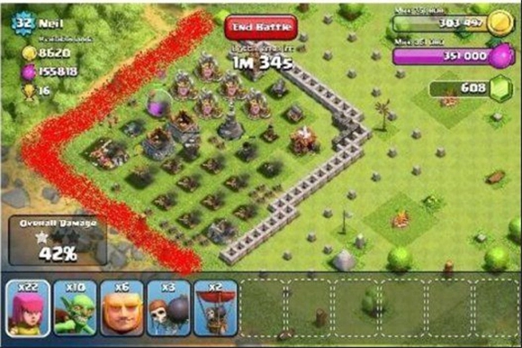城墙能很好地起到保护防御设施和资源的作用,但要是仅仅用城墙把防御建筑圈起来,其实不会给对手造成太大麻烦。不少新手玩家常犯的一个错误,就是让防御建筑直接暴露在敌方远程攻击的火力范围内,这种情况下,对手只需派几个弓箭手或法师,就能轻松摧毁一个防御设施。比较好的布局方法是,在有围墙保护的防御建筑外面放一些非防御类建筑,这样既能吸引敌人的火力,又能让己方的防御持续发挥作用。需要留意的是,地图的四条边可不能用来代替城墙阻挡敌人进攻。