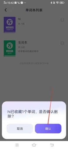 3、最后在弹出的窗口里点击“确认”按钮,这个单词本就能被删除了。