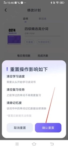 3、待弹出窗口出现后,点击“确认重置”按钮,即可完成计划进度的重置操作。