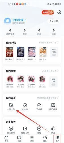 1、启动UC浏览器,点击“我的”图标进入个人中心页面,找到“我的网盘”选项,再点击“全部文件”图标。