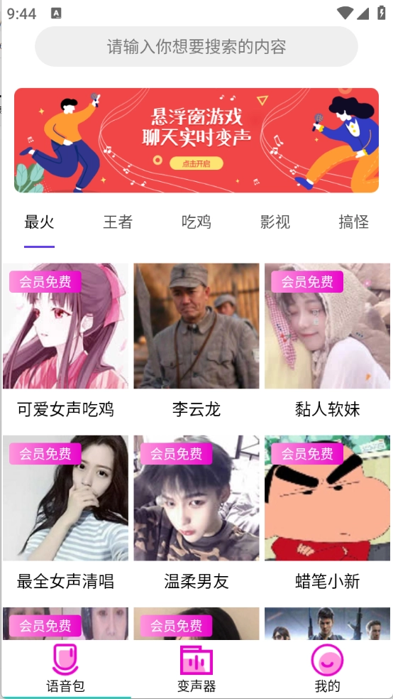 进入首页后,这里汇集了大量语音包,涵盖了最火、王者、吃鸡、搞怪等多种类型。