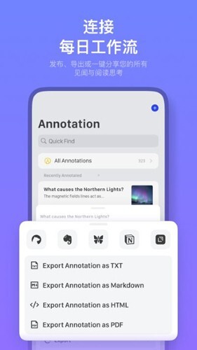 通过自定义动作,可按照需求的格式将内容输出至笔记应用,并且支持Markdown等格式。