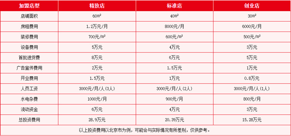 加盟费用根据不同店型可以划分不同的加盟费用等级,下表是以北京市为例,可能会与实际情况有所差别,具体情况可以拨打酒便利招商加盟电话 0371-68998068 进行咨询。