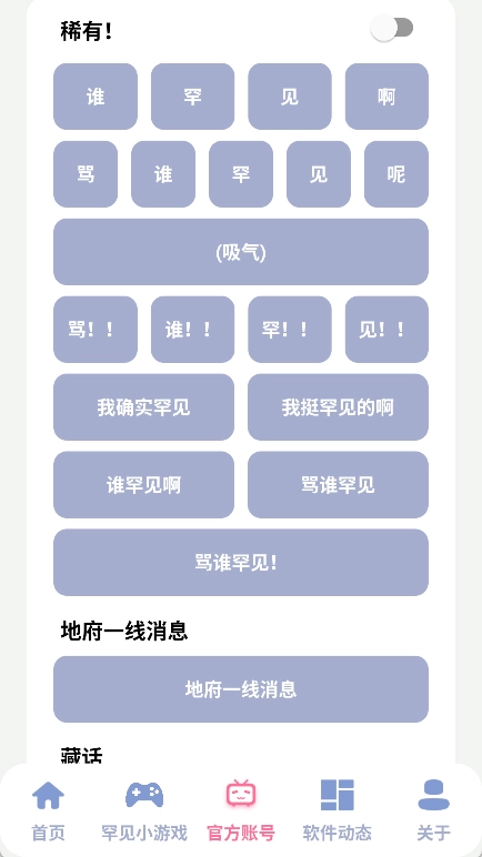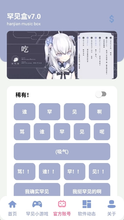 罕见盒是一款集合了大量魔性语音包的手机娱乐应用,用户能在这里免费获取并使用各类趣味十足的语音资源。罕见盒7.0版本操作便捷,界面清新雅致,适配多种使用场景,不管是日常消遣还是游戏互动,都能为用户增添不少欢乐。而且平台每日都会更新语音资源,让用户随时跟上潮流,体验当下最新、最火的语音内容,罕见盒V7.0堪称趣味语音爱好者不可或缺的实用工具。