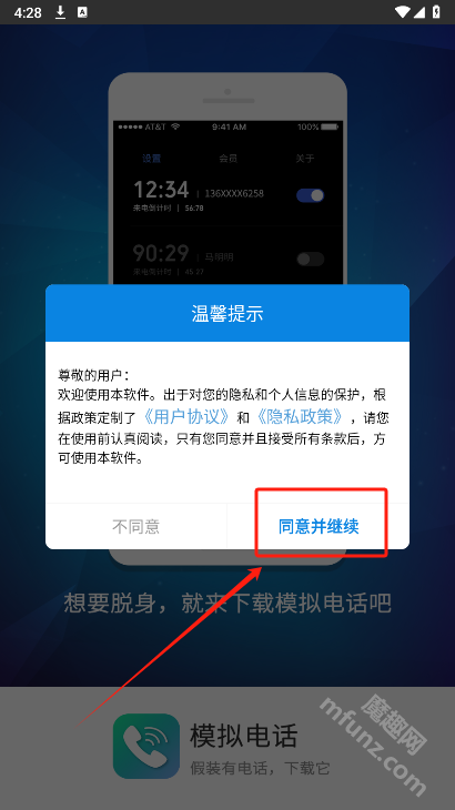 1、首先在魔趣网下载并安装模拟电话软件,接着点击“同意并继续”按钮进入首页。