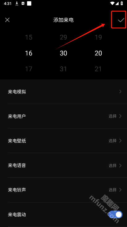 4、设置来电时间、来电用户、来电壁纸、来电铃声等信息,接着点击右上角的“√”即可完成操作。