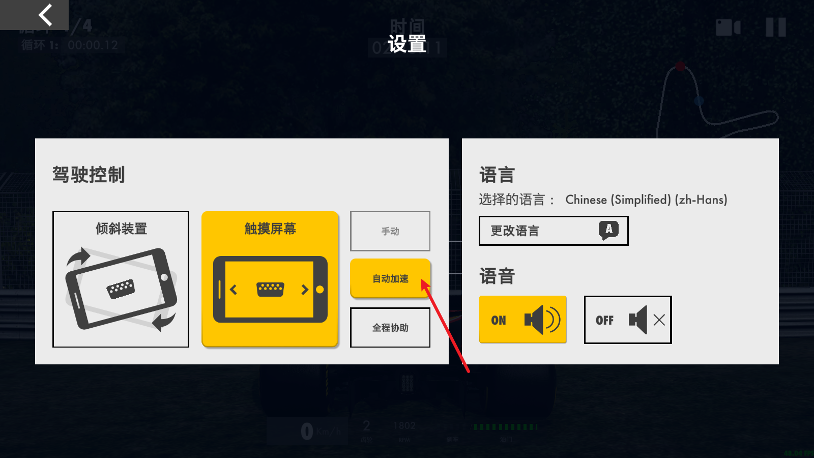 我们可以在设置里将其调整为自动加速模式,如此一来,我们就只需操控转向和刹车即可。
