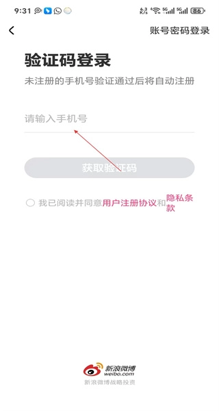 3、进入验证码登录界面后,要先输入手机号码,接着点击“获取验证码”按钮,再勾选相关协议,这样就可以准备完成登录操作了。