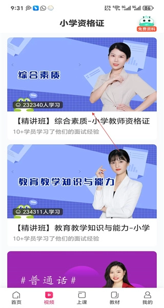 完成登录操作后进入视频页面,这里会展示综合素质等精讲班课程,你可以查看课程信息并进行学习操作。