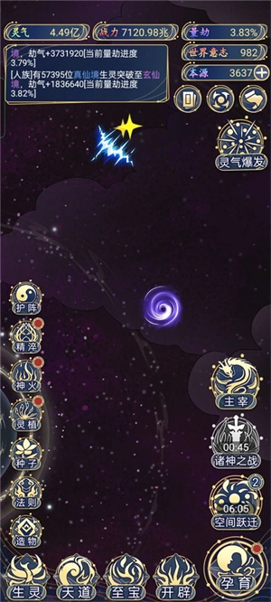 2、借助构建与更新各类规则,同时修补空间裂隙、布设防护法阵,能够让世界发展更趋稳定;此外,还可通过投放珍稀神物等方式,引发不同生灵种族间的角逐,促成合理的良性竞争,从而助力它们在特定阶段实现更快成长。