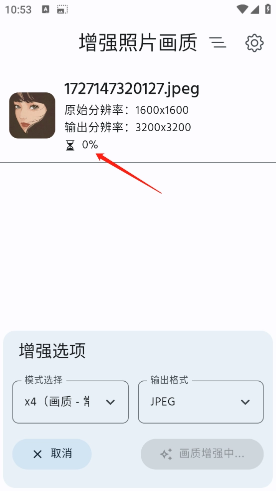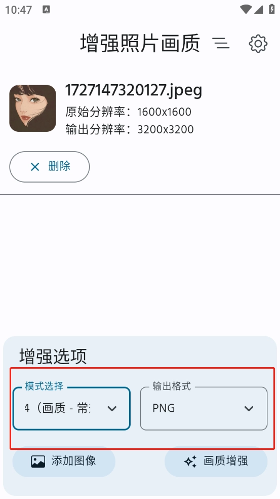 3、选好照片后,选定画质模式与图片输出格式,再点击“增强画质”按钮。