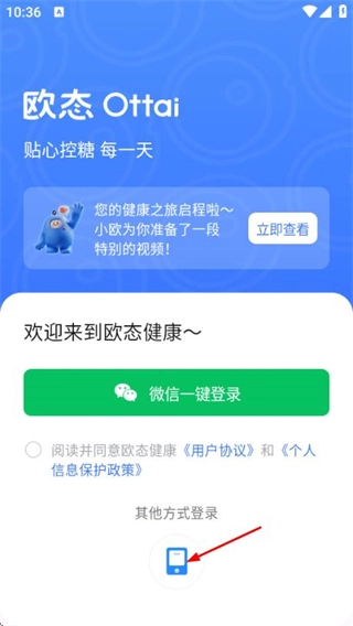 1、打开欧态健康应用后,选择其他登录方式,跳转至手机登录界面。