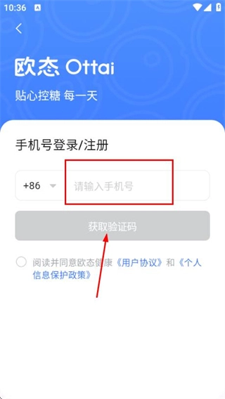2、进入手机验证登录页面,输入手机号,勾选相关协议,随后点击“获取验证码”按钮。