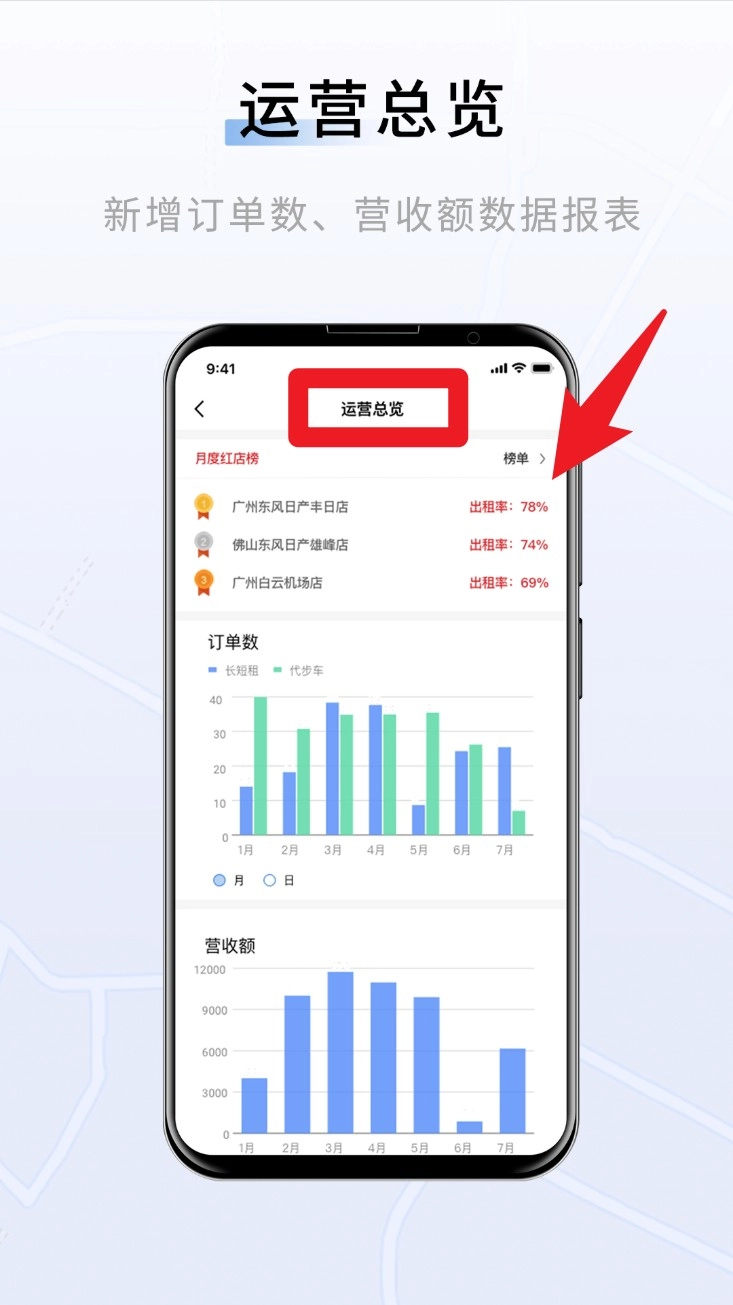 2. 登录系统后,点击“运营总览”板块即可查看月度租赁相关数据,其中涵盖订单总数以及各车型的日、月趋势变化,有助于门店第一时间对自身经营状况展开评估。