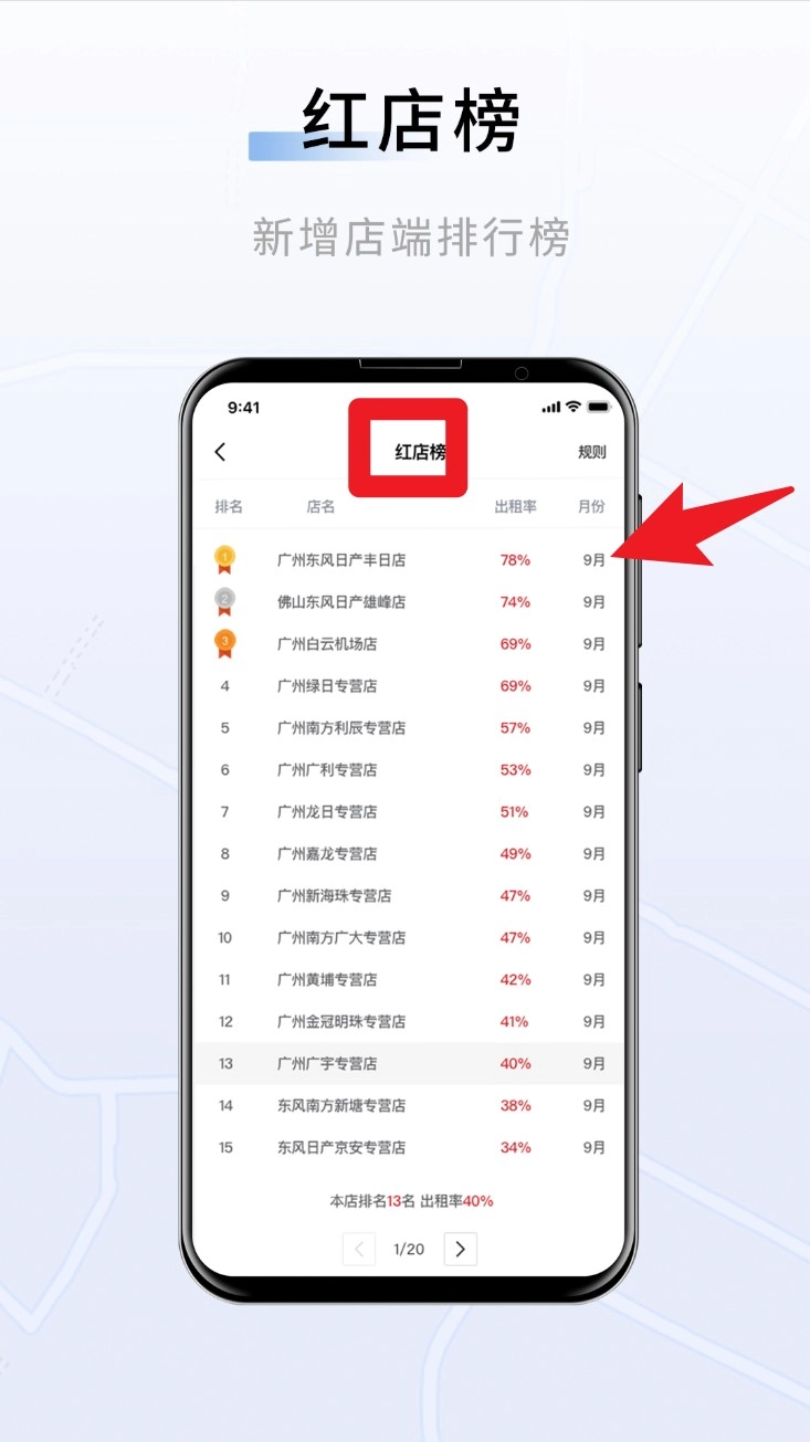 3. 进入红店榜模块后,能够查看门店租赁排行榜,该排行榜按照出租率和月份进行排序,有助于门店对比自身表现,进而提升整体运营效率。