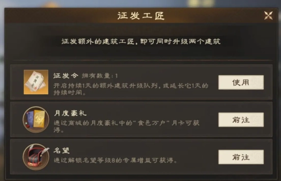 当然这中间还是得攒一阵子原料,耗时也比较久,这段时间里大家可以体验民生、进行探索,一定要记得去看看商肆,要是碰到玉璧或者玛瑙建议直接入手,等探索等级提升到2级后,带着这两个信物去寻访就能触发特殊事件啦。
