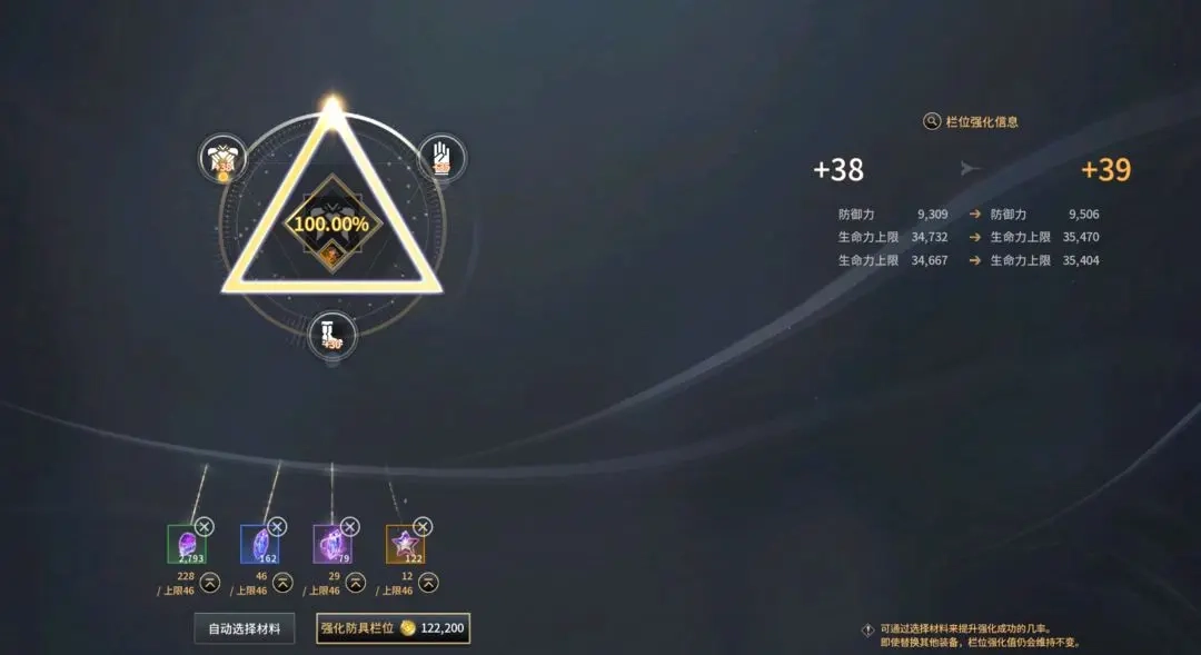 2、防具栏强化方面,由于防具材料的获取难度较大,所以建议采用100%成功率的强化方式。