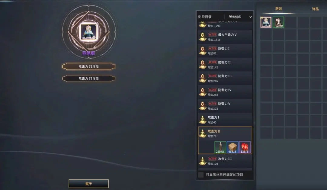 5、刻印:给时装或饰品附加额外能力值,以此提升角色的特定属性。进行刻印前,需先借助工艺制作出「魔法赋予卷轴」这一道具。