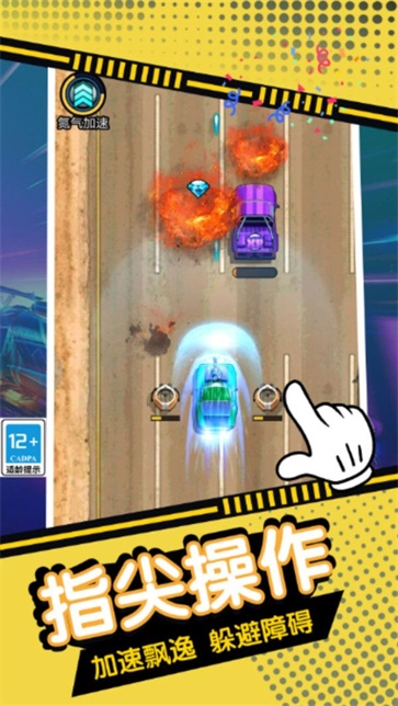 1、借助指尖的操作来把控飞车的行进方向,在赛道上完成加速、漂移动作,避开各类障碍。