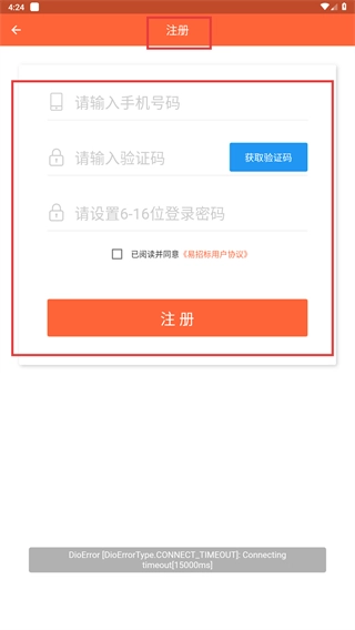 4、要是还没有注册账号,就点击【注册】按钮,接着按照提示填写手机号码、验证码,设置好密码,再勾选相关协议,这样就能完成注册了。