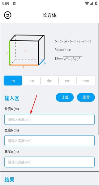 3、进入长方体计算界面,页面会展示对应的几何公式;先选择好单位,再依次填入长a、宽b、高c的数值,最后点击计算按钮,即可得到相关几何量的结果。