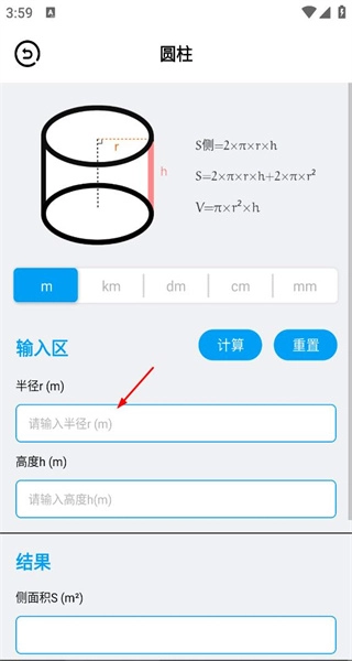 4、进入圆柱计算页面后,系统会显示侧面积等相关公式;选定所需单位,填写圆柱的半径与高度,点击计算按钮,即可获得对应的几何计算结果。