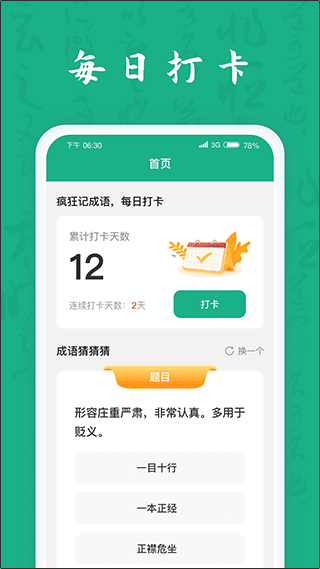 1、下载并安装疯狂成语王应用程序后,进入首页即可进行每日打卡学习,并可参与成语小游戏。