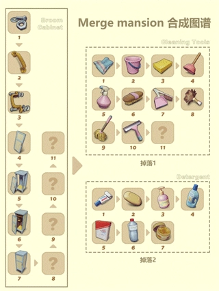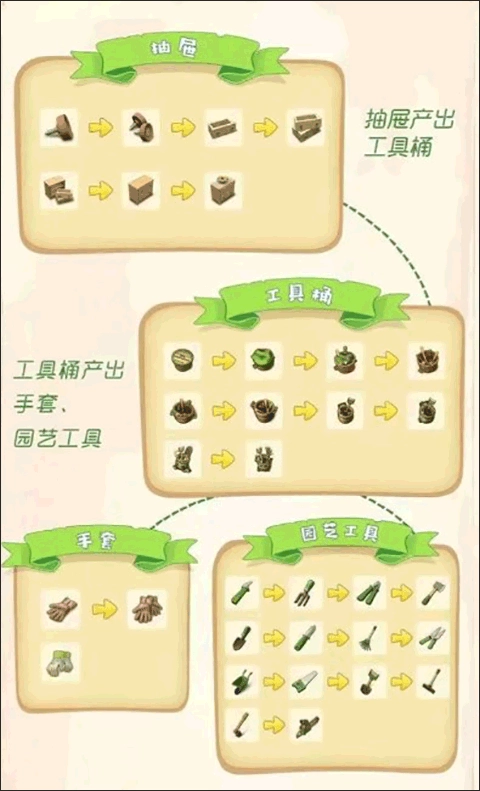 首先是工具这类的,园林工具可以说是我们在游戏过程中最想需要的一类物品了,我们在获得基础的园林工具前,需要先获得工具桶,工具桶会在一段时间后给大家提供工具,等发完后将会进入到冷却阶段,需要等到冷却结束才可以再次给大家提供工具,而工具桶则是需要抽屉来获取,下图就是工具类的合成图。