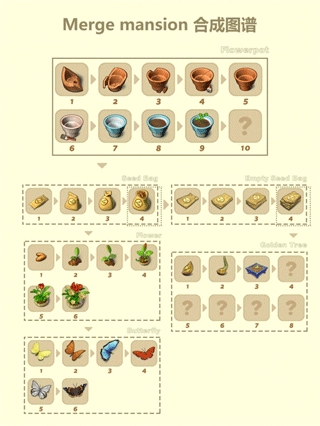 花和收纳袋这类可以有效地让我们的庄园更加漂亮,这些都是通过种子袋获取,而种子袋由花瓶产出,花瓶是从抽屉那获取的,合成图我放在下面了。