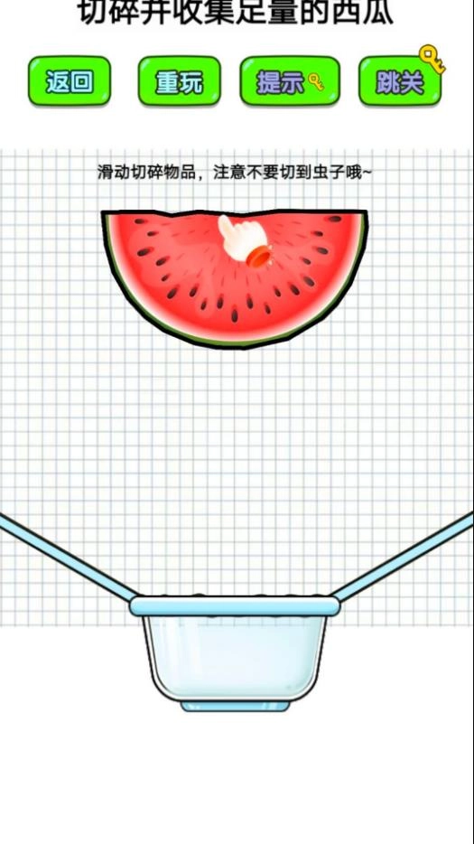 1、进入游戏后查看关卡提示,明确切割目标物品与收集要求,牢记不切到虫子的核心规则开启挑战。
