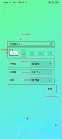 2. 在首页里,能够便捷地创建新项目,还能迅速完成项目名称、分辨率以及背景颜色的设置。