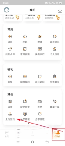 1、在应用中找到“我的”入口,点击“上传游戏”选项,即可上传你本地存储的游戏。