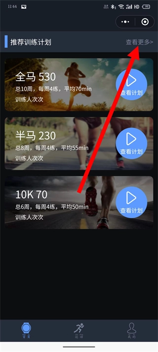 1、打开宜准跑步应用,找到推荐训练计划板块,点击“查看更多”按钮,进入全部计划页面。