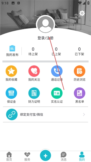 3、进入【我的】页面,可查看【我的发布】【我的收藏】等功能入口,点击【登录/注册】可进入账号操作环节。