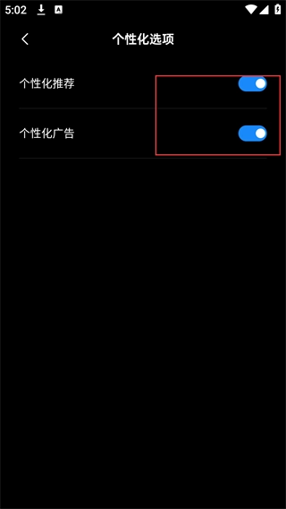 4、在个性化选项页面,可通过开关按钮分别控制“个性化推荐”“个性化广告”的开启或关闭状态,按需调整后即可完成设置。