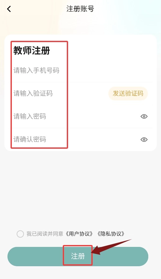 3、注册时输入手机号、验证码并设置双重密码,点击注册完成。