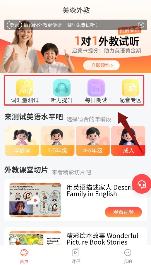 2、首页提供词汇量测试、听力提升、每日朗读与配音专区功能。