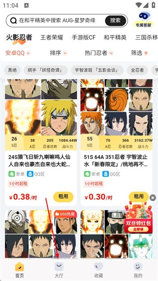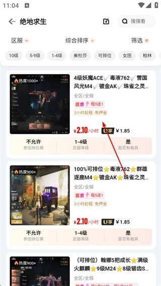 2、在全部游戏页面,点击目标游戏,可进入该游戏的账号租赁列表页面。