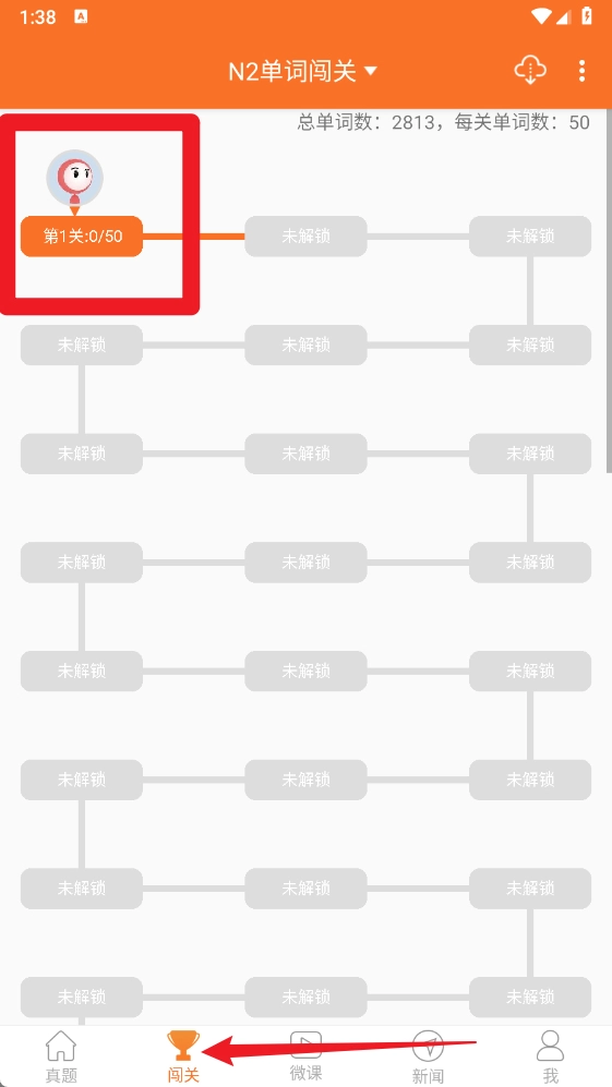 3、在闯关板块中可以逐关挑战词汇任务,每一关有固定单词数,帮助系统化背诵。