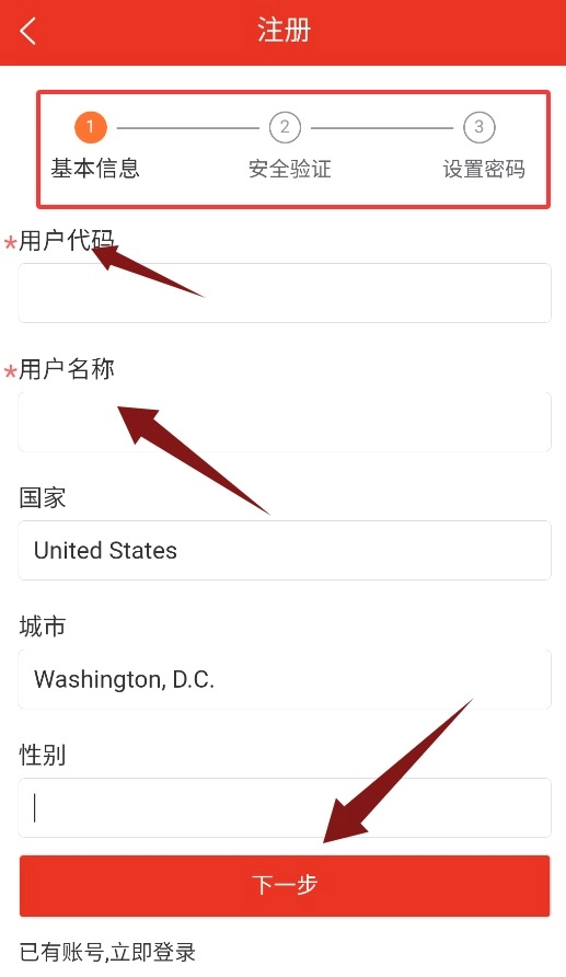 3、注册环节需填写用户代码、名称、国家、城市及性别信息,完成安全验证后再设置密码。