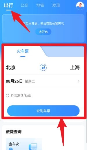 3、进入出行页面后,填写出发地和目的地的相关信息,选定乘车日期,接着点击查询车票按钮,就能看到列车的具体信息了。